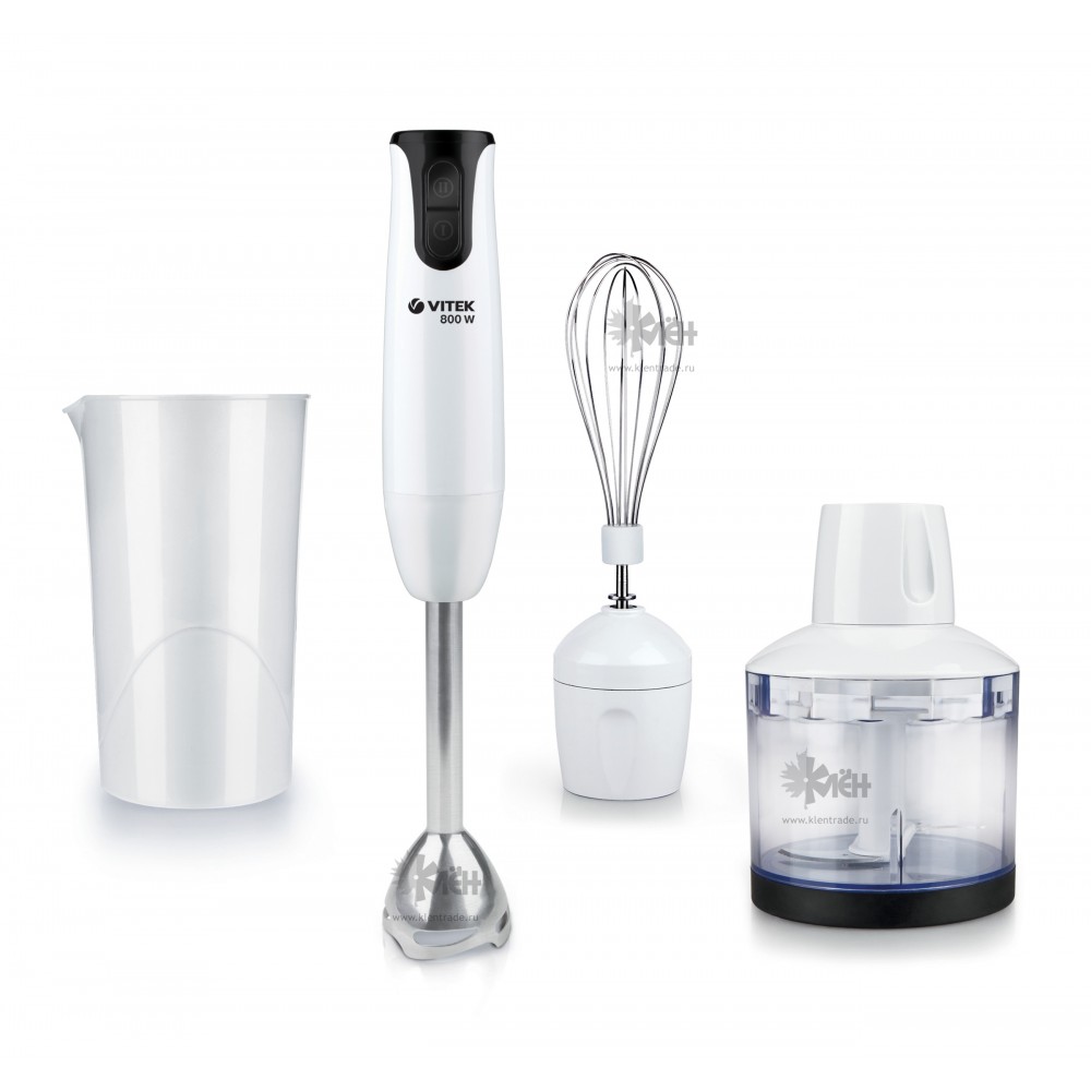 Блендерный набор VITEK VT-3412 W состоит из мощного (800 Вт) моторного блока и 3-х дополнительных насадок. Насадка чоппер объемом 0,5 л поможет вам измельчить чеснок, сыр, мясо или овощи за пару минут. Хотите сделать клубничный коктейль? Возьмите погружной блендер и удобный стакан для смешивания продуктов (0,7 л). Для начинающих кондитеров в комплекте с прибором идет венчик. Им удобно взбивать сливки, или делать крем для тортов.